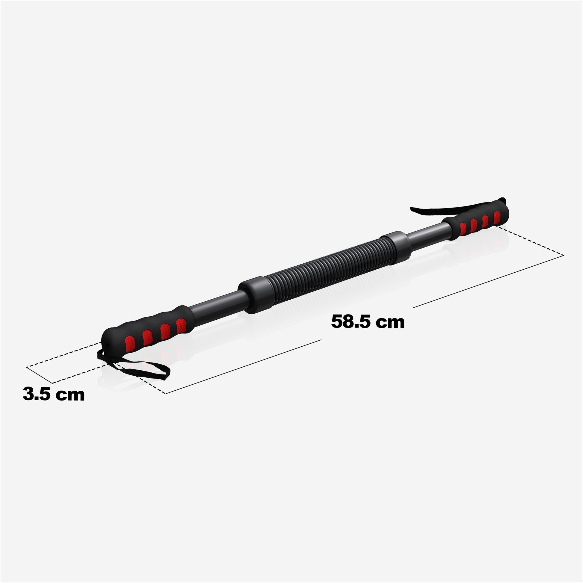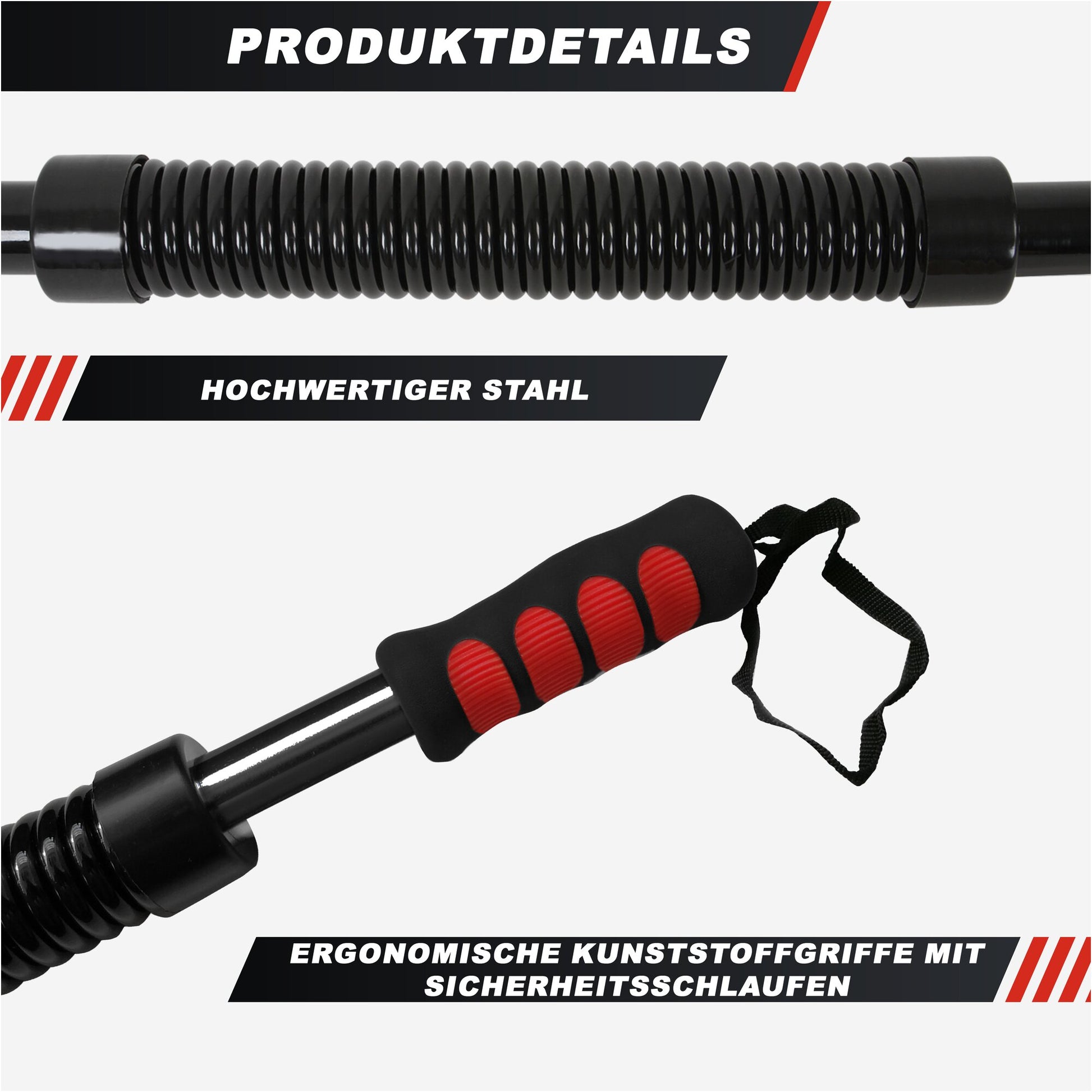 Matériaux : Barre en acier, caoutchouc thermoplastique (noir), polypropylène (rouge)
