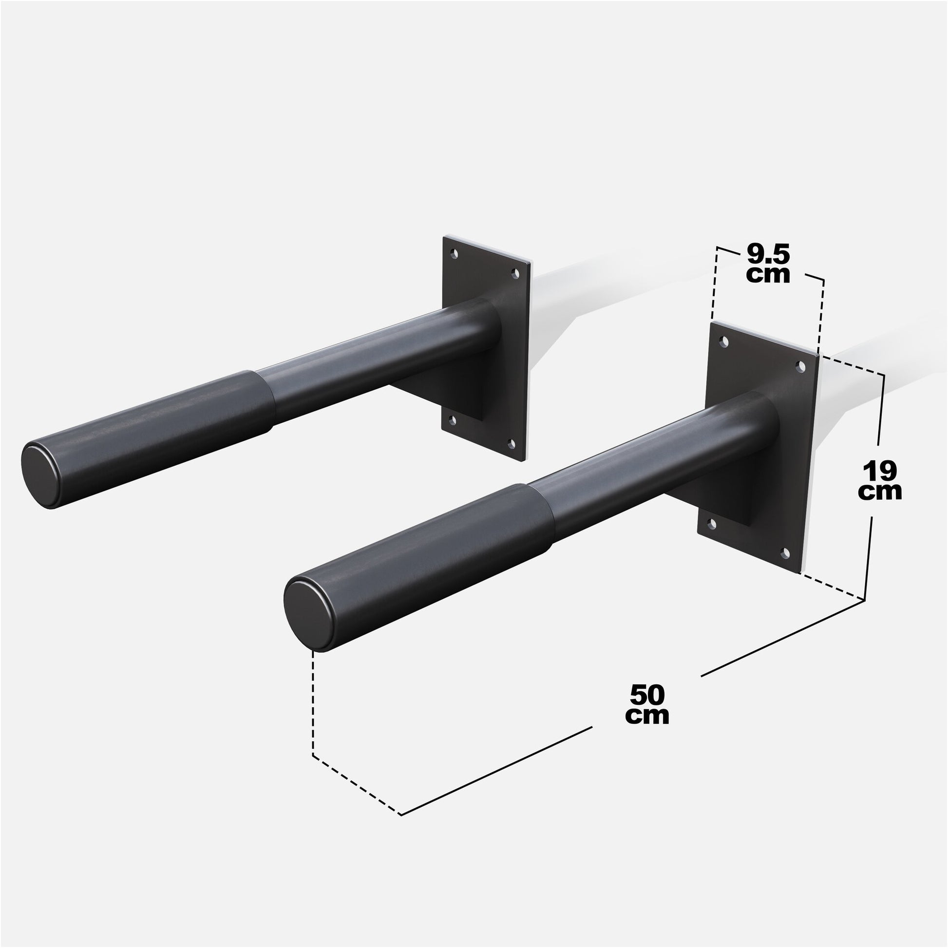 Les barres de dips à fixation murale en noir de Gorilla Sports sont idéales pour les dips, qui permettent de travailler efficacement les triceps ainsi que les pectoraux. Elles peuvent être utilisées avec un entraînement au poids corporel ou avec des poids supplémentaires. Les barres sont fabriquées en acier extrêmement solide et peuvent supporter des charges allant jusqu'à 350 kg lorsqu'elles sont fixées au mur. Leurs tubes en acier ont un diamètre de 5 centimètres, et leurs poignées mesurent chacune 51 centimètres de long.