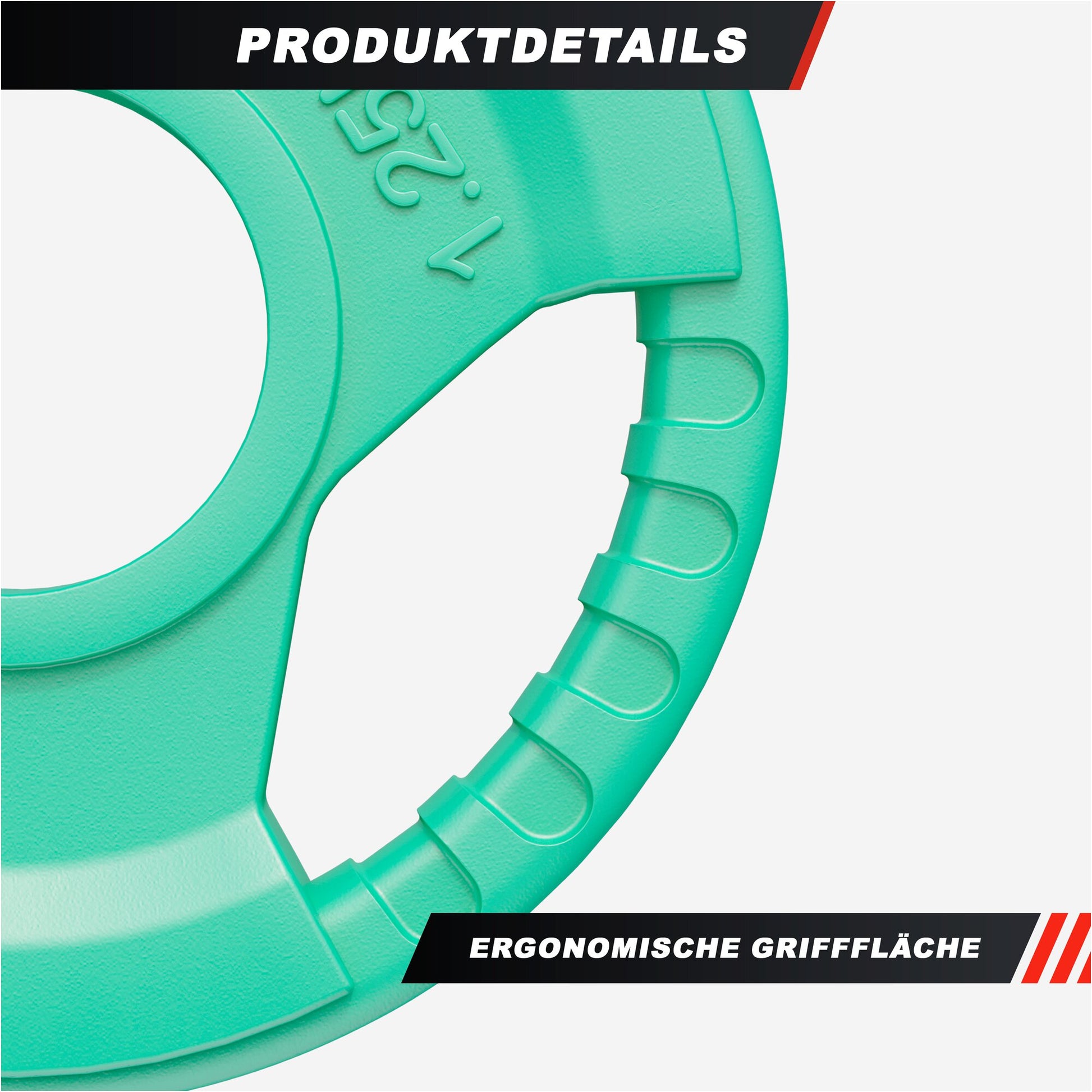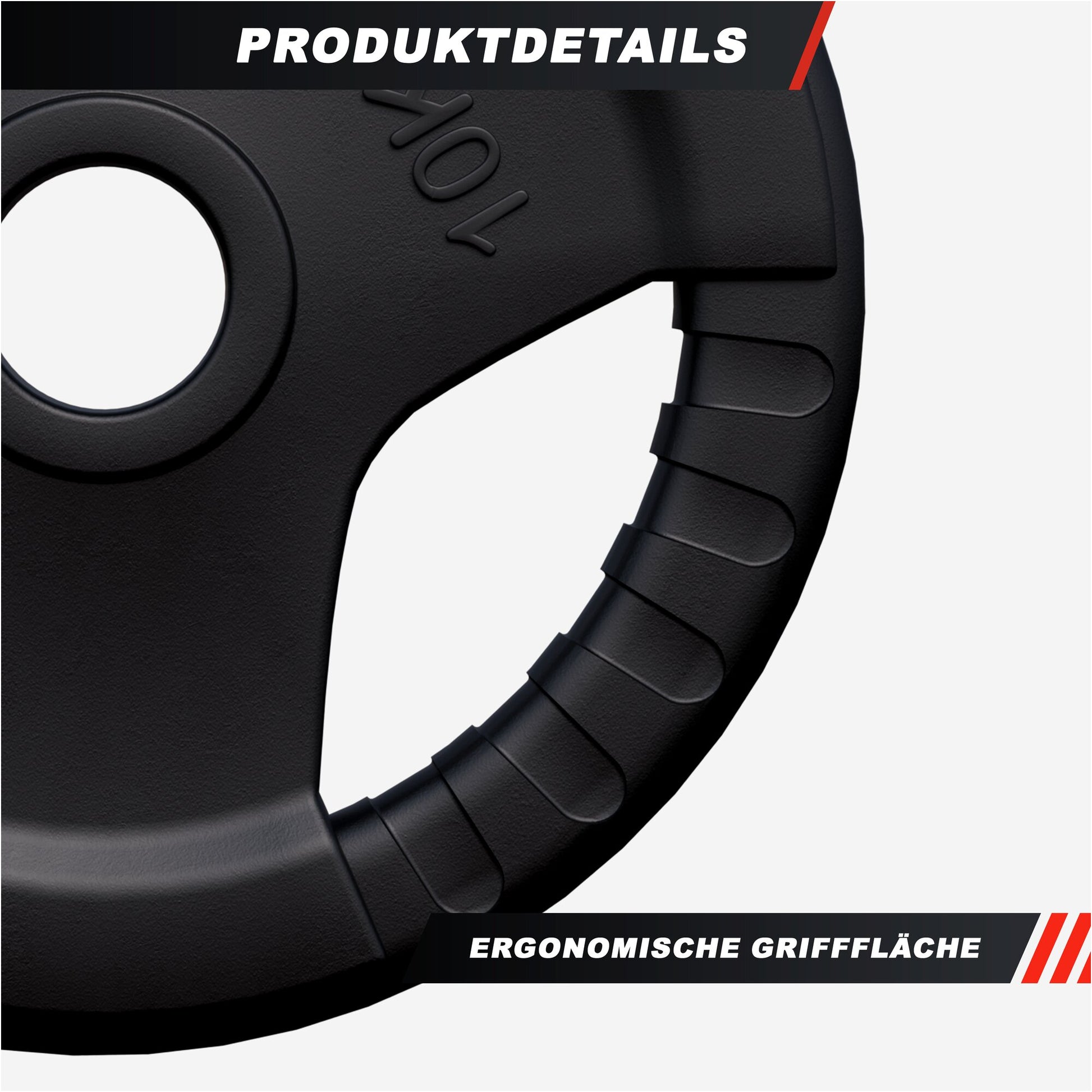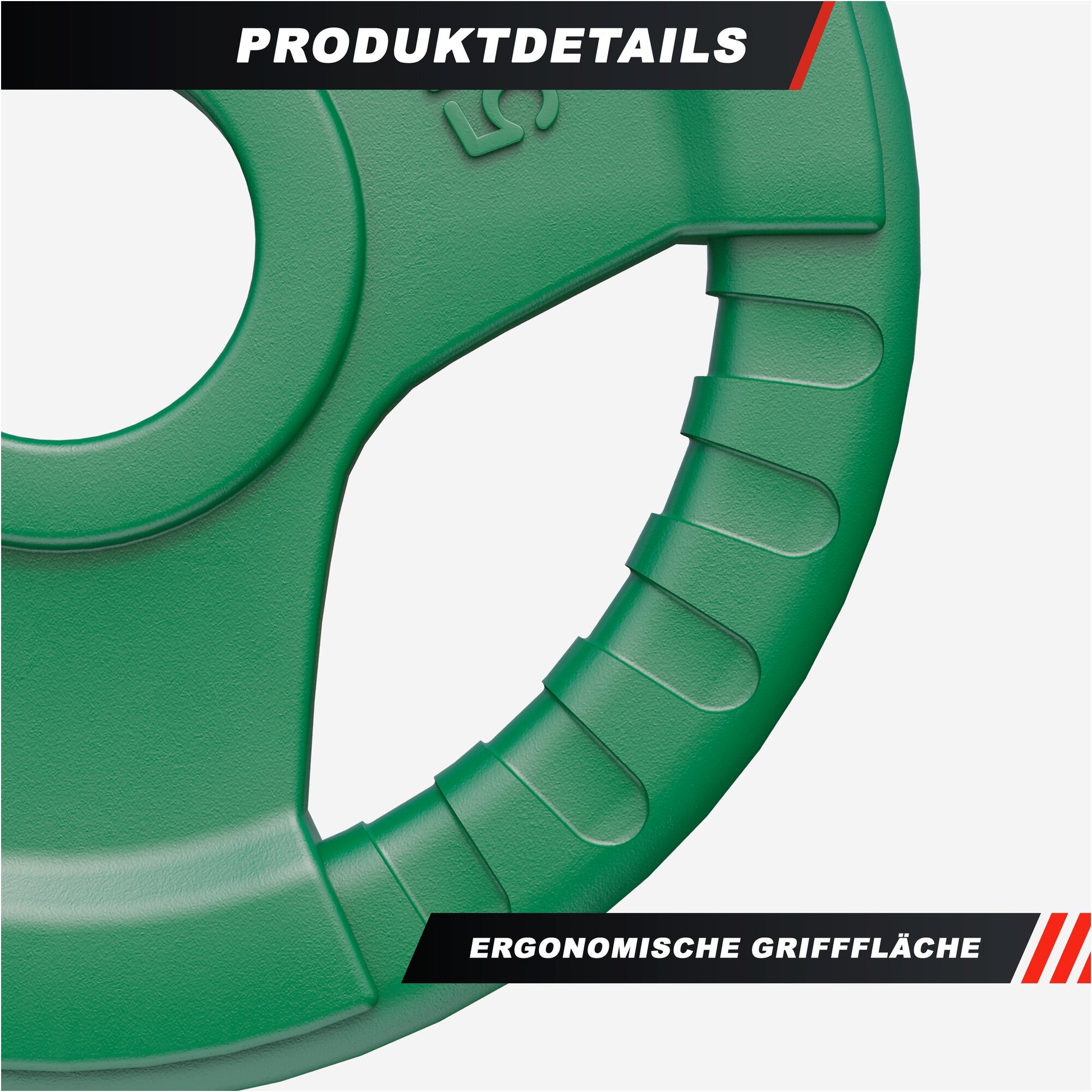 Le disque olympique 50/51 mm avec poignées grip en caoutchouc de Gorilla Sports, disponible en poids de 1,25 kg, 2,5 kg, 5 kg, 10 kg, 15 kg, 20 kg et 25 kg, est idéal pour l'entraînement en musculation avec des barres longues d'un diamètre de 50 mm. Ces disques vous offrent une flexibilité optimale pour les exercices de base et d'isolation tels que les squats, les curls ou le développé-couché.