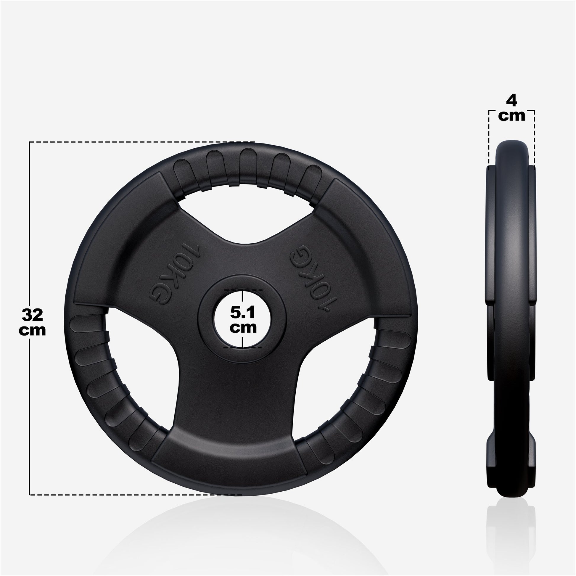 - Compatible avec toutes les barres olympiques de 50 mm grâce à un trou de 50/51 mm.