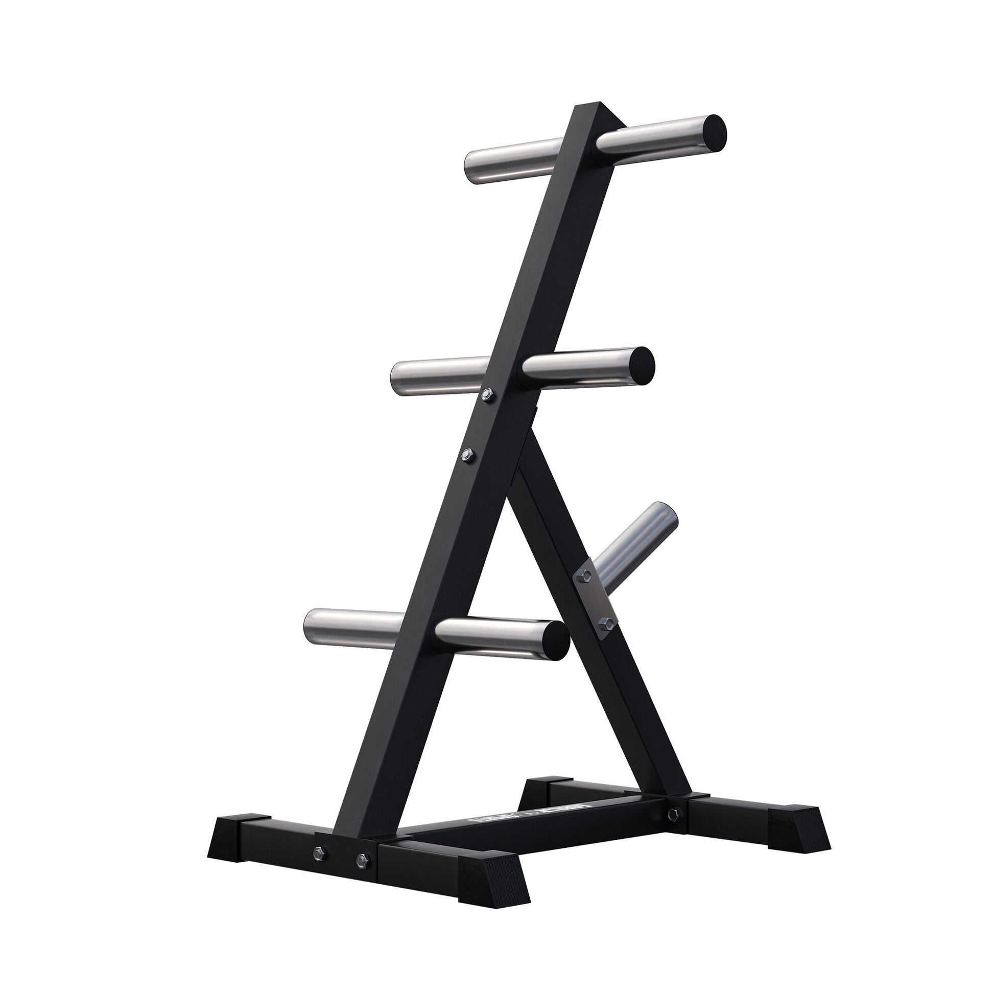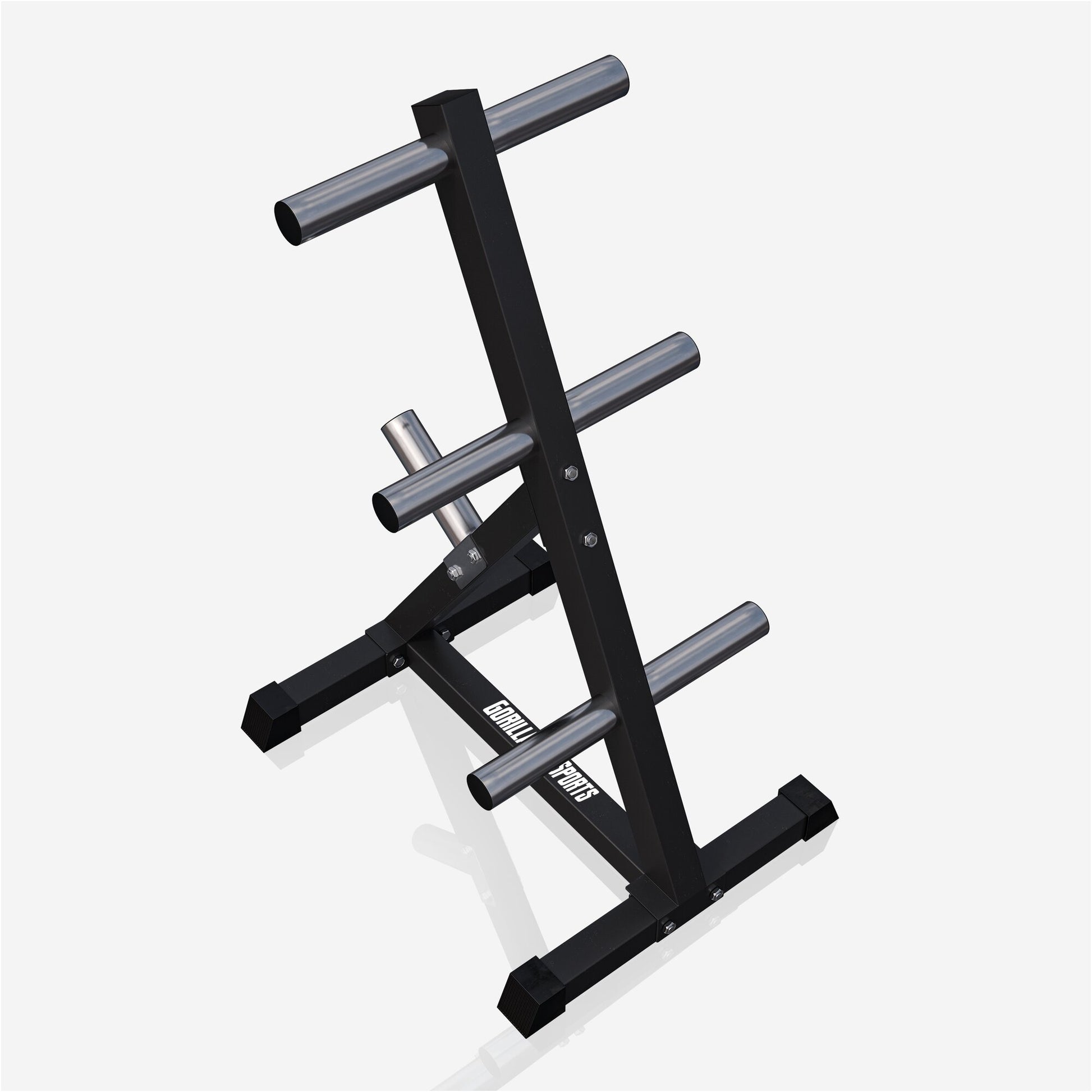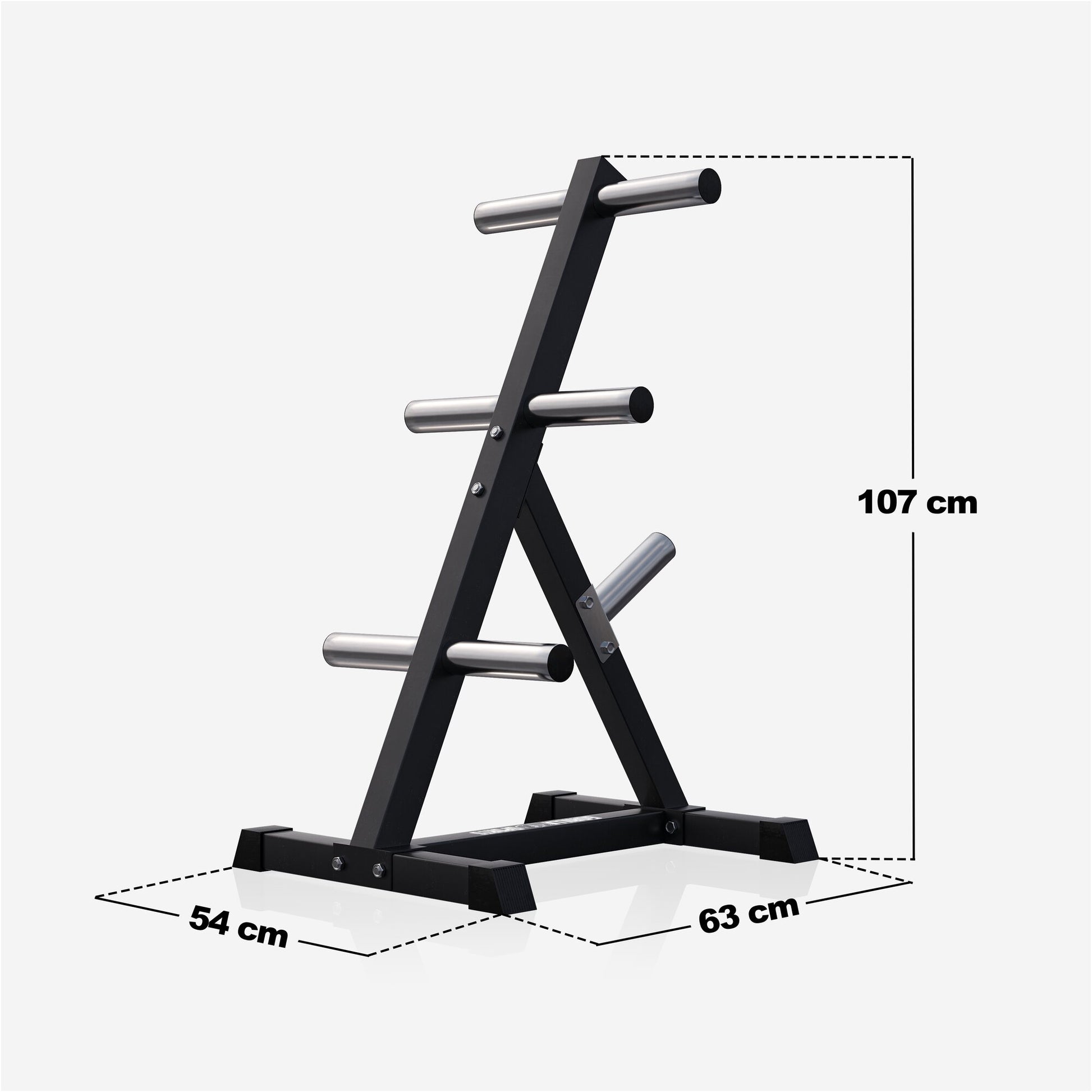 Le rack de rangement pour disques olympiques sur 4 niveaux de Gorilla Sports crée de l'ordre dans votre espace d'entraînement avec sept emplacements séparés pour les haltères. Chaque barre mesure 20 cm de long et est conçue pour des disques avec un diamètre d’alésage de 50/51 mm. Le rack mesure 107 cm de haut, pèse 12,5 kg et peut supporter jusqu'à 350 kg de poids.