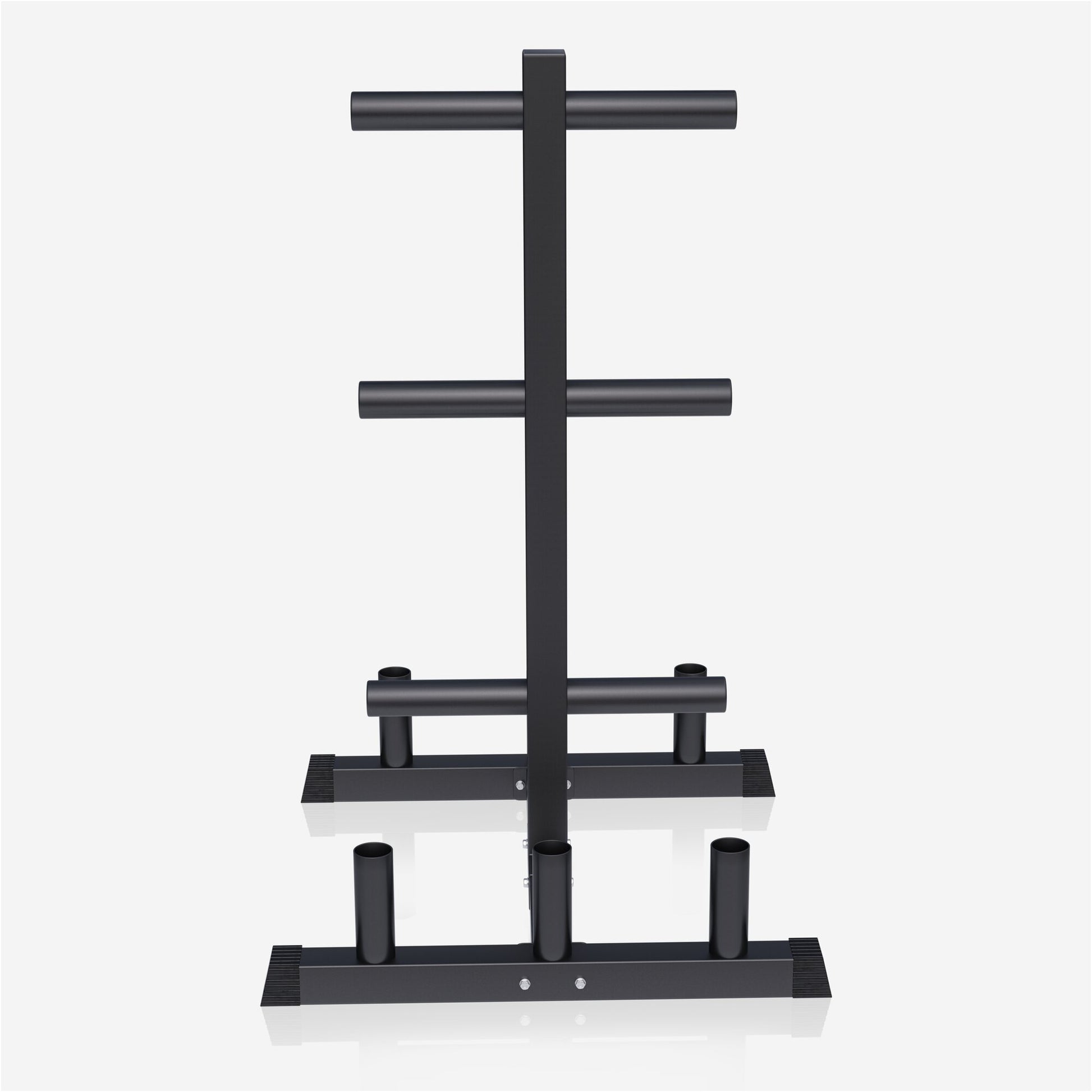 Le rack pour disques et barres olympiques est équipé de pieds en caoutchouc et donc reste stable à tout moment même sous une charge unilatérale. Les supports individuels ont un diamètre de 50/51 mm, ce qui signifie que les disques que vous souhaitez empiler doivent avoir un alésage de 51 mm.