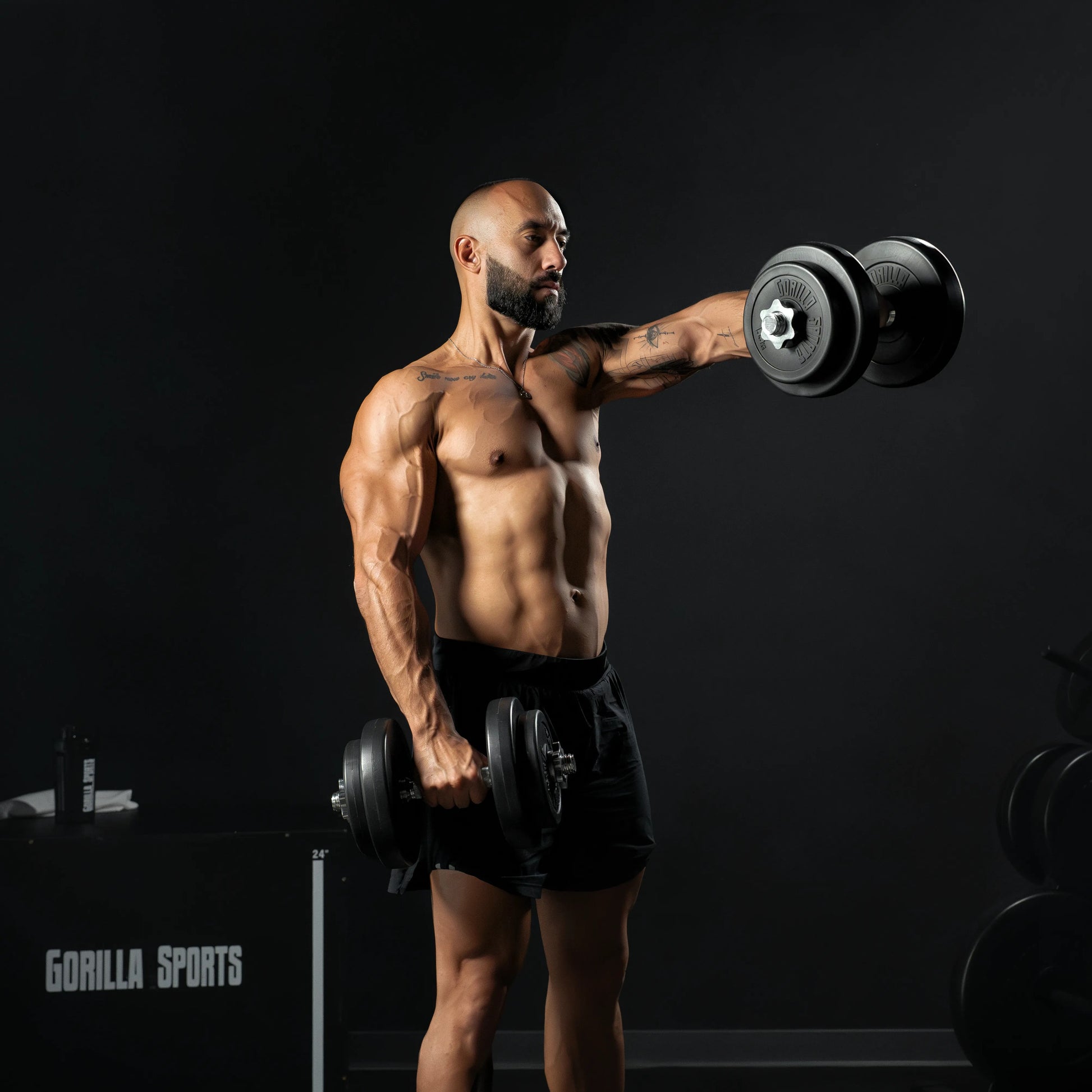 Lors de l'entraînement avec des haltères courts, la plupart des gens pensent d'abord aux curls de biceps classiques et aux extensions de triceps. Mais les exercices de base sont également possibles avec le set d'haltères courts en plastique de 20 kg. Par exemple, vous pouvez utiliser les haltères comme poids pour des presses d'épaules ou des squats. Et ce n'est pas tout. Un exercice complet du corps extrêmement efficace avec des haltères est par exemple le Dumbbell Thruster, une combinaison de squat et de presse d'épaules.