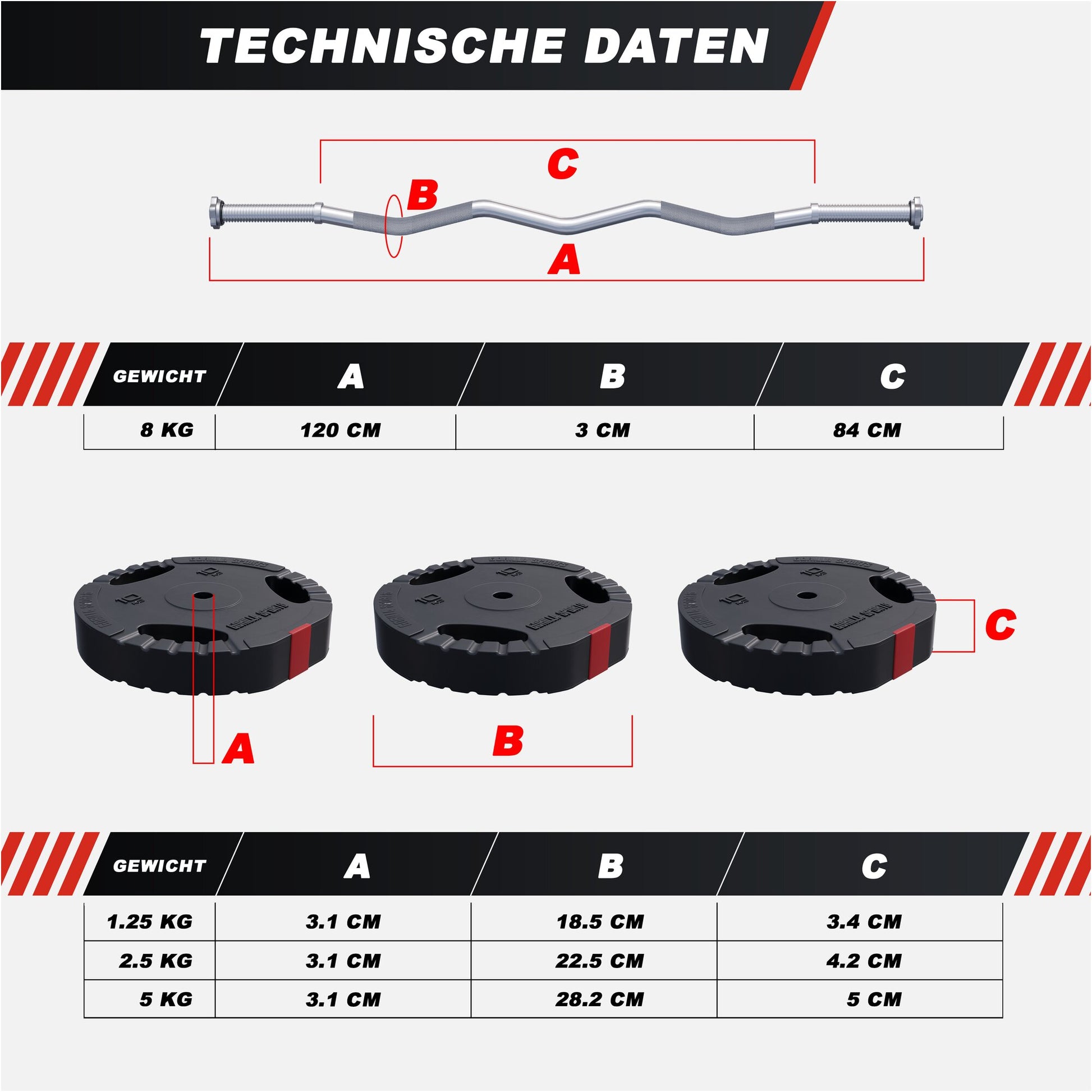 - 1 barre curl SZ de 120 cm (poids 8 kg), surface de réception de chaque côté de la barre 18 cm