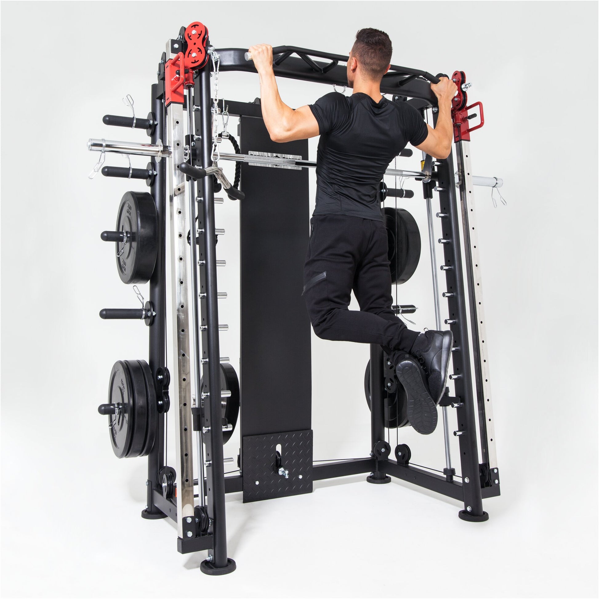 La Smith Machine mesure 219 x 127,5 x 218,5 cm et pèse 195 kg. La barre longue de 10,6 kg et la structure en acier robuste offrent la stabilité nécessaire même pour les séances d'entraînement les plus intenses. En combinant cet appareil avec un banc de musculation et des disques, vous obtenez un studio de fitness multifonctionnel chez vous.