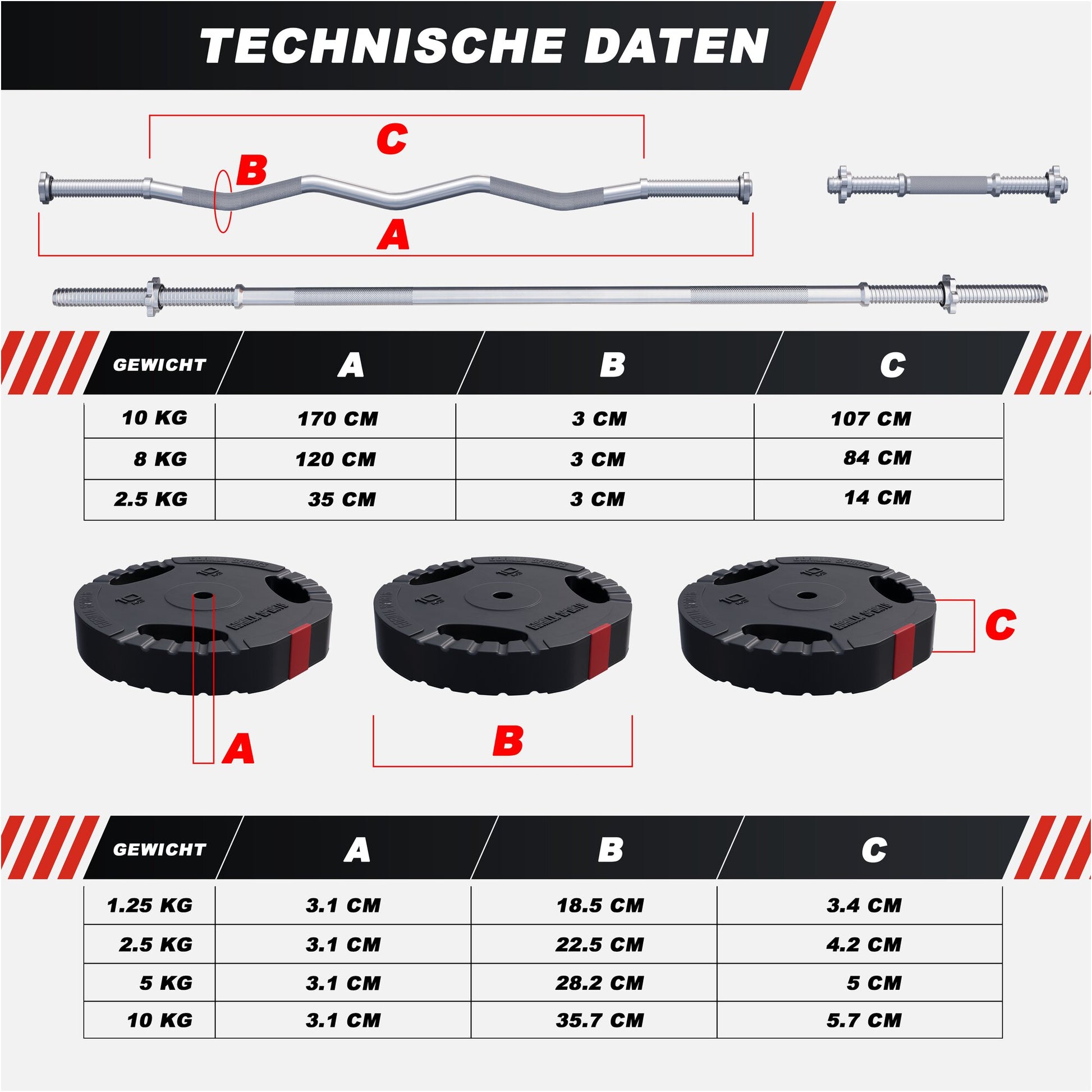 • 2 barres d'haltères courtes 35 cm (poids 2,5 kg chacune)