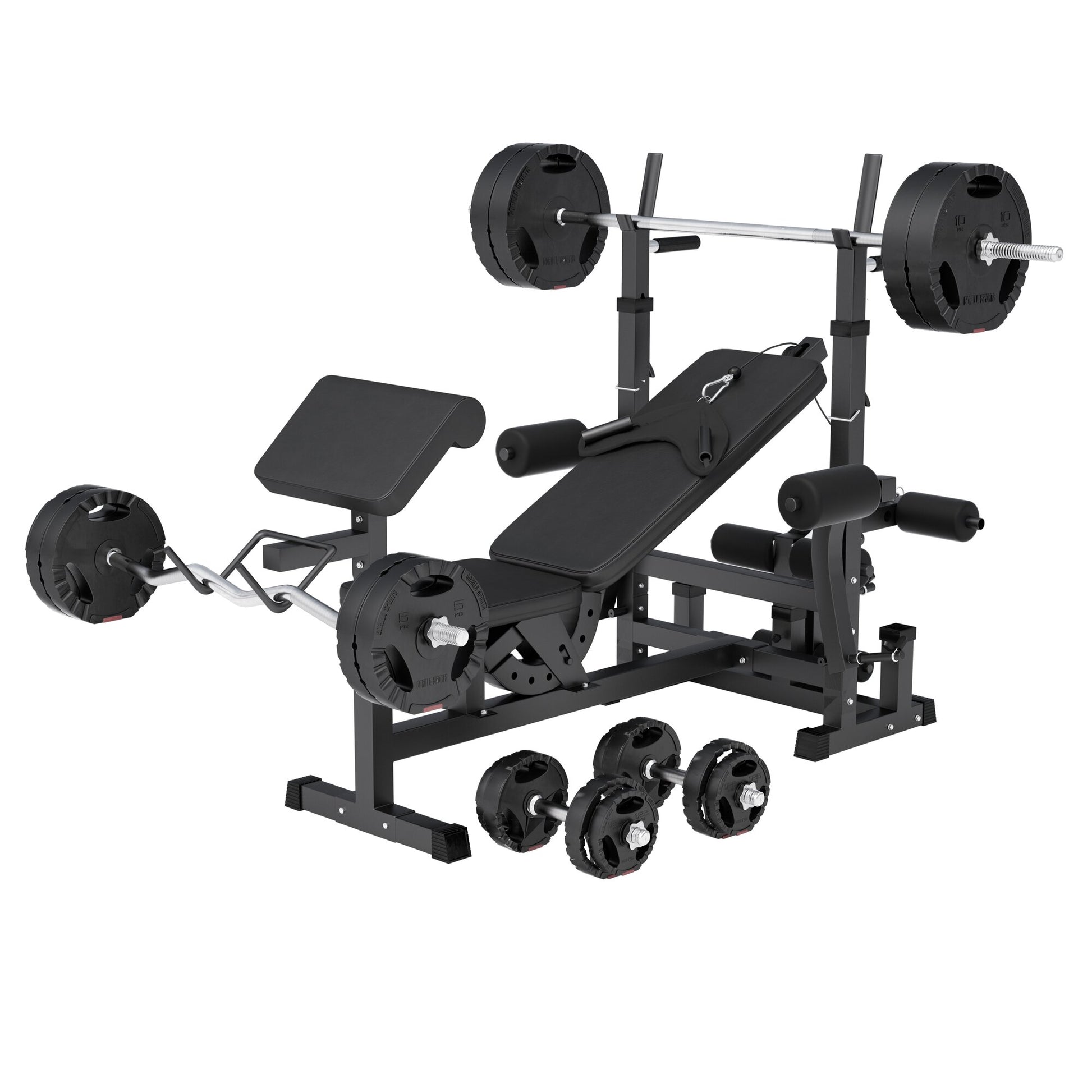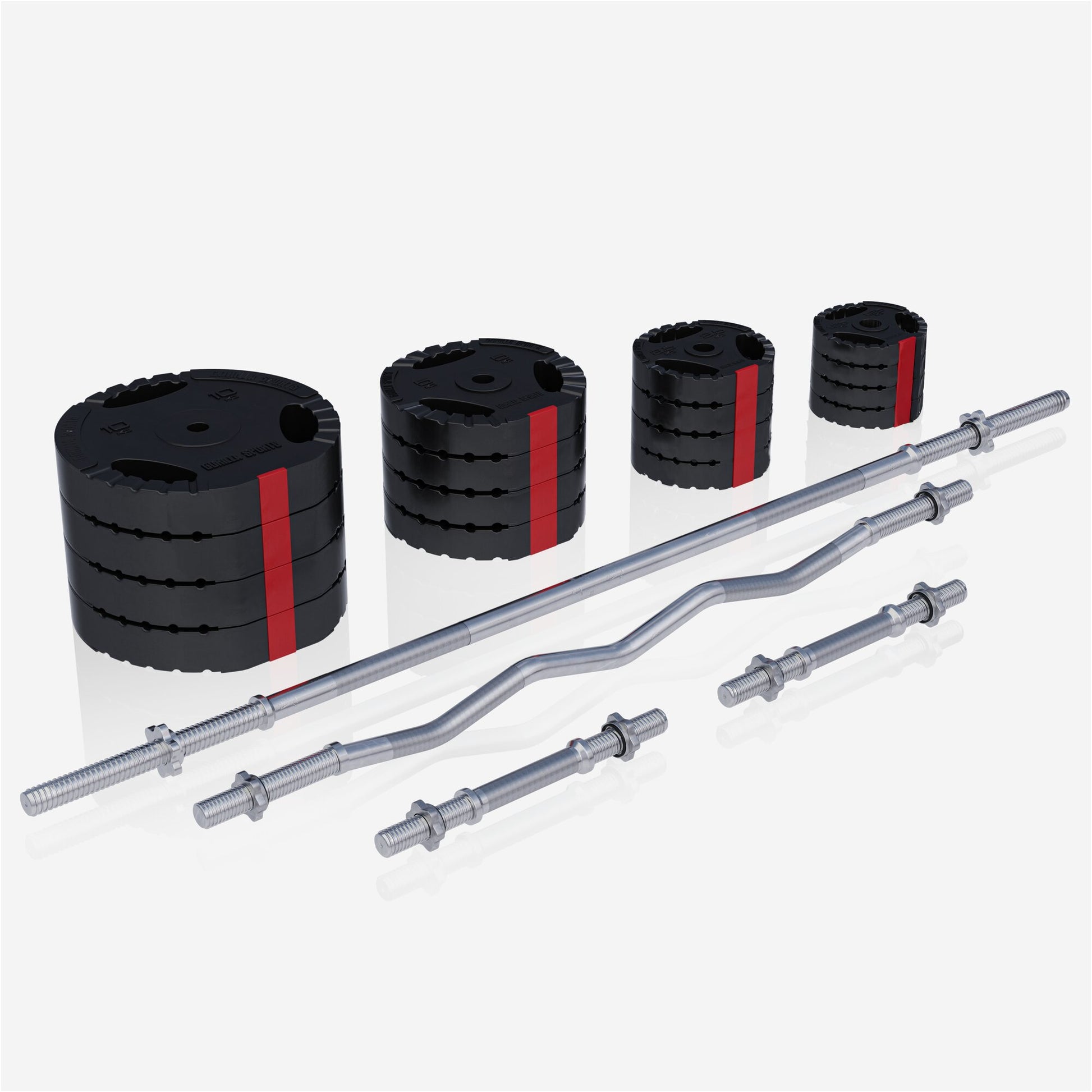 Aucune limite à l'entraînement avec la station de musculation universelle incluant un set d'haltères en plastique de 100 kg avec poignées grip