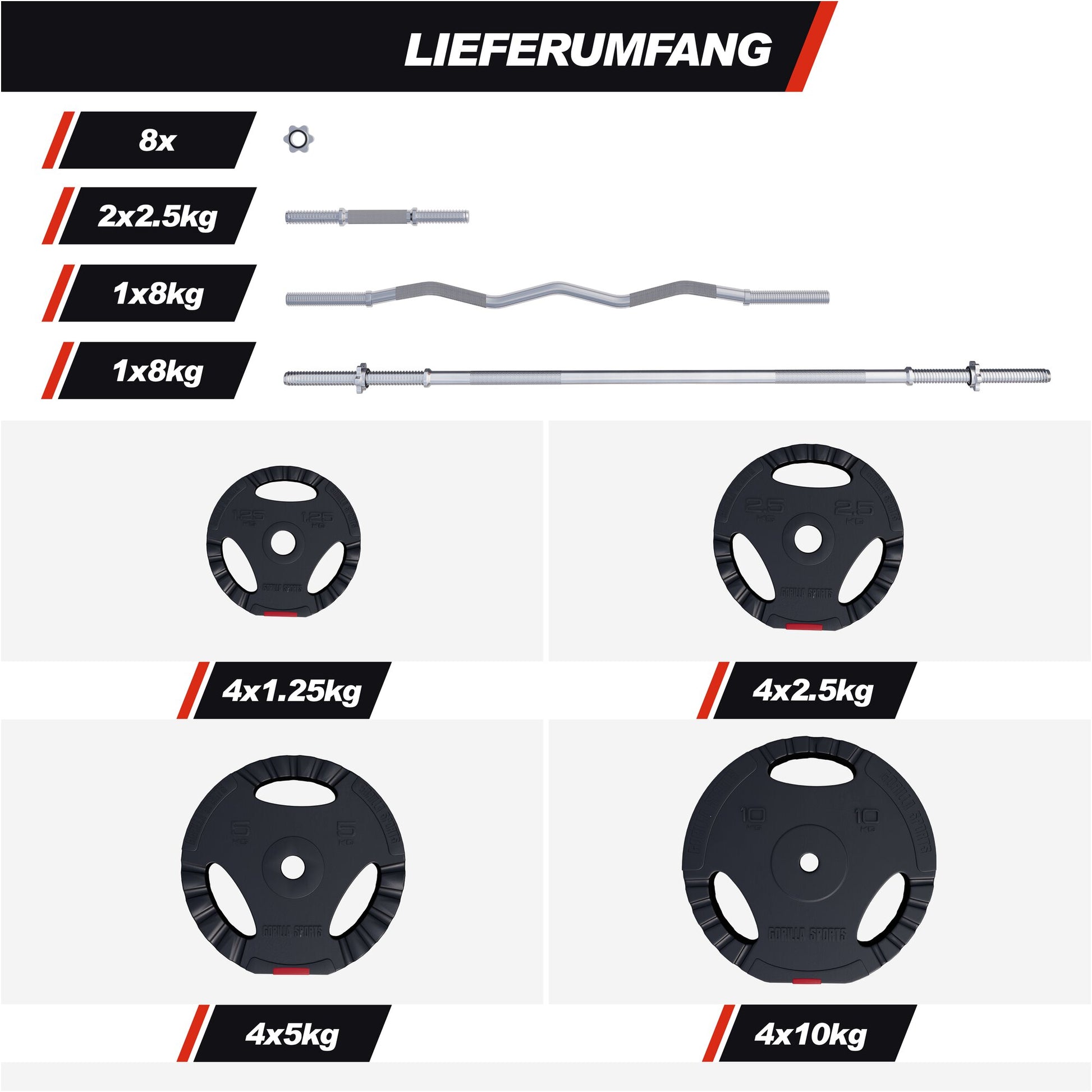 Détails du set complet de 100 kg avec poignées grip en plastique :