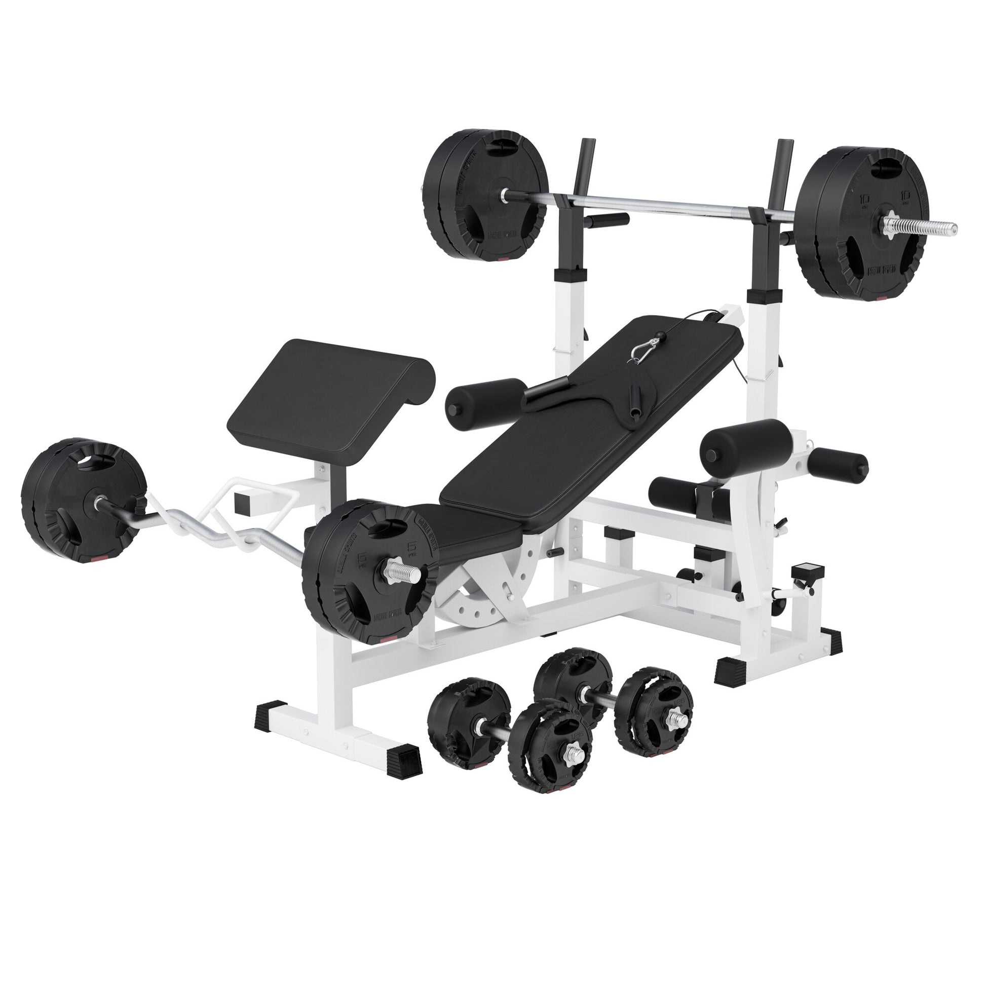 Entraînement varié avec la station de musculation universelle incluant un set d'haltères en plastique de 100 kg avec poignées grip en noir et blanc