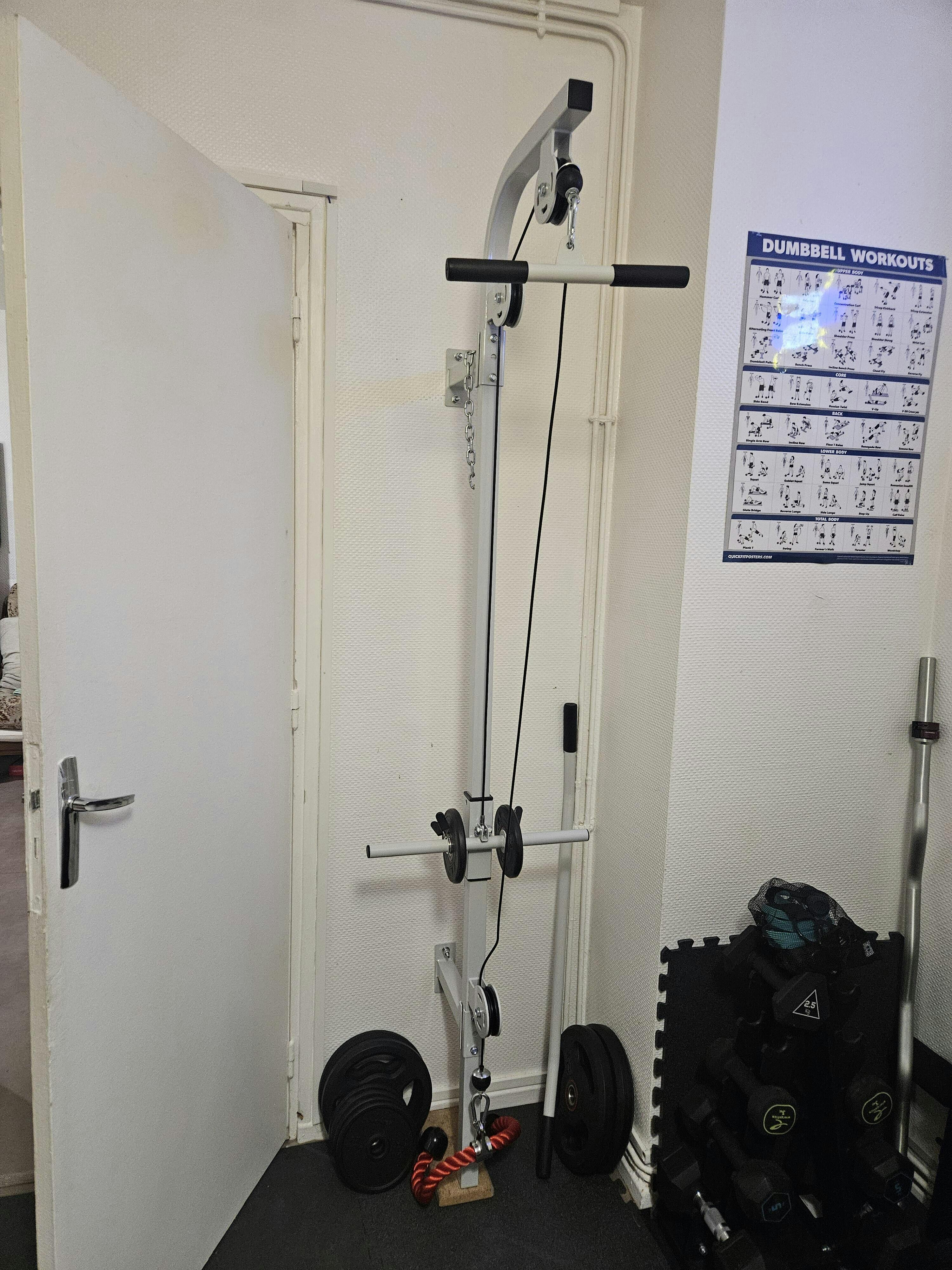 - Comprend un tirage latéral et une barre à triceps